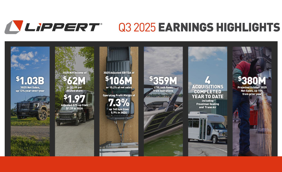 LCI Industries, Eigentümer von Lippert, der führenden Marke für Freizeitfahrzeug-Komponenten, hat die Ergebnisse des dritten Quartals seines Geschäftsjahres 2025 veröffentlicht. Darin heißt es, dass die Diversifizierungsstrategie, Innovation und Fertigungsoptimierung auch weiterhin für künftige Gewinne sorgen dürften.